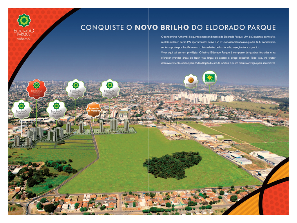 Diante deste grande sucesso, surge o Eldorado Parque, a apenas 2 km do Bairro Eldorado, duas vezes maior, com todos os aprimoramentos, inovações e qualidade de vida garantida. Situado em uma região de alto desenvolvimento e fácil acesso, o Eldorado Parque traz a grande oportunidade de se morar ou investir em imóveis de visível valorização no mercado.